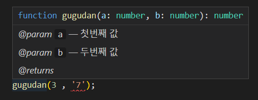 // @ts-check 를 기재해주면 자동으로 함수에 타입스크립트가 적용되어 위처럼 컴파일 과정에서 에러를 감지하여 개발자에게 알려주는 것을 확인할 수 있다.