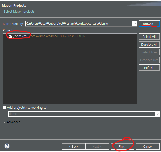 - Browse 버튼을 눌러 프로젝트를 지정해주고 pom.xml 파일이 나타날 거다 Finish를 눌러 완료하자.